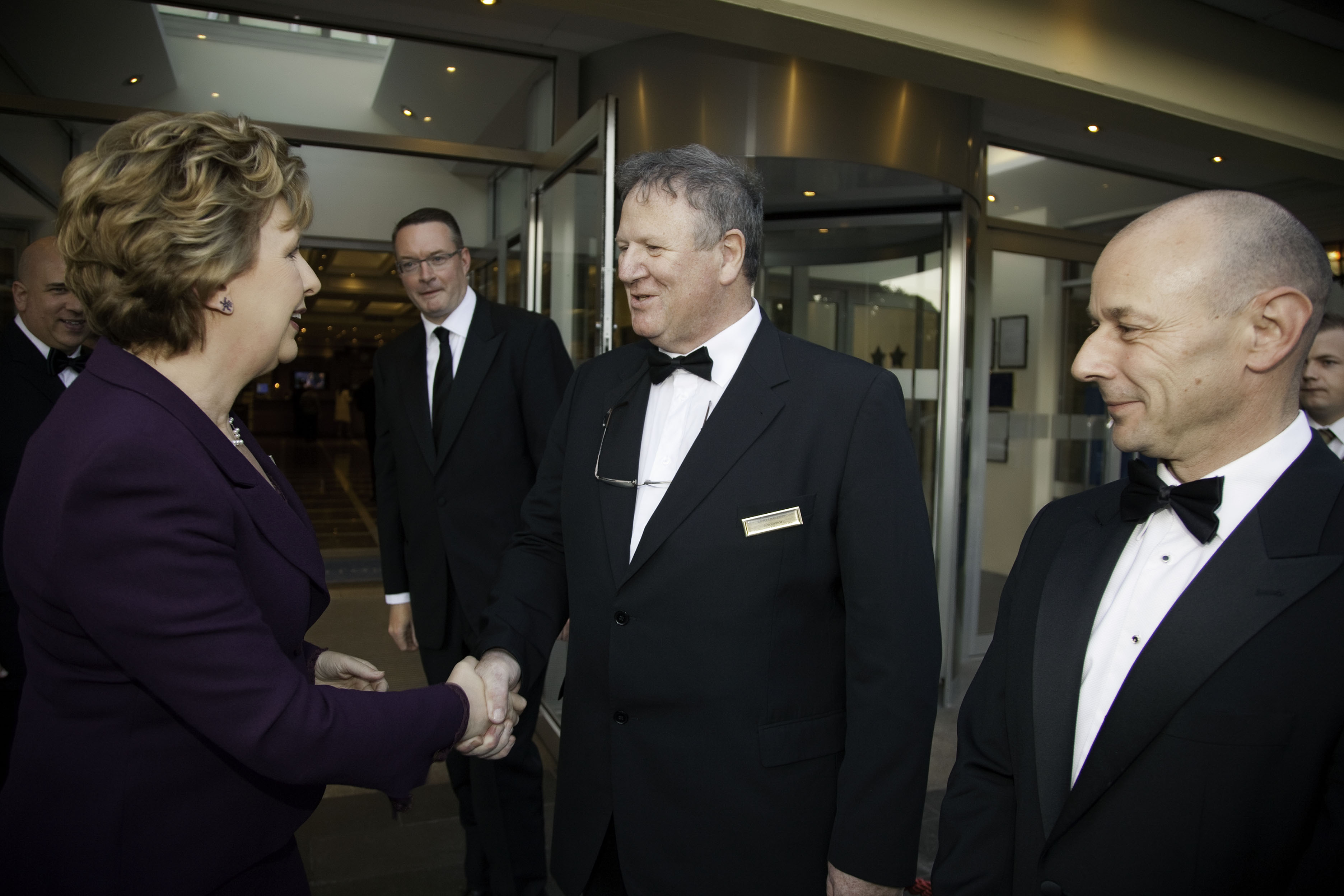 President Mary McAleese greeted by John Conmee and John Clifton, Burlington Hotel